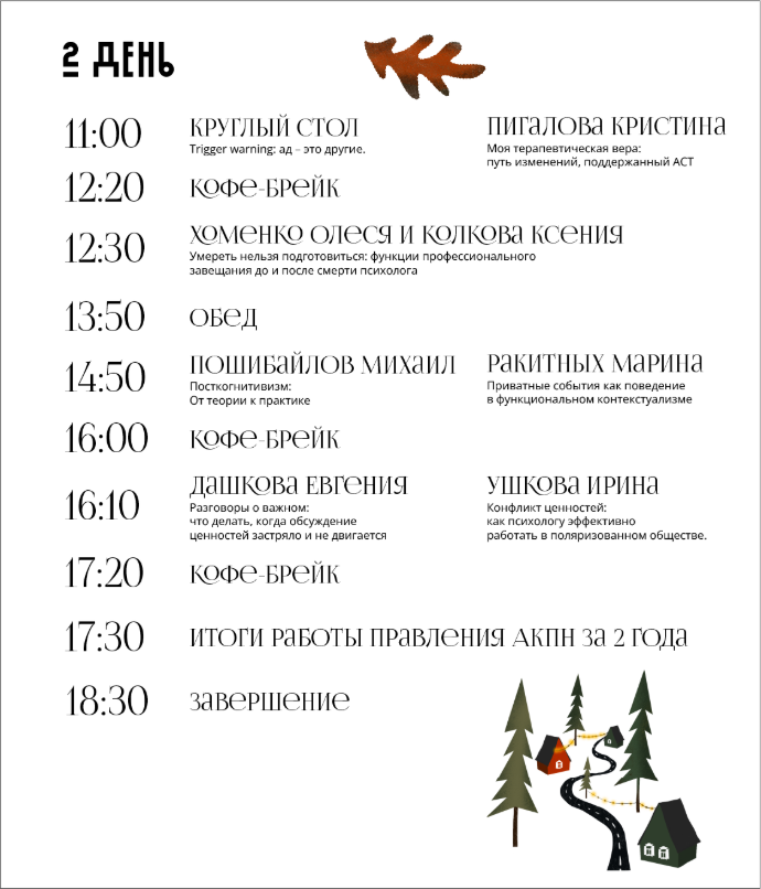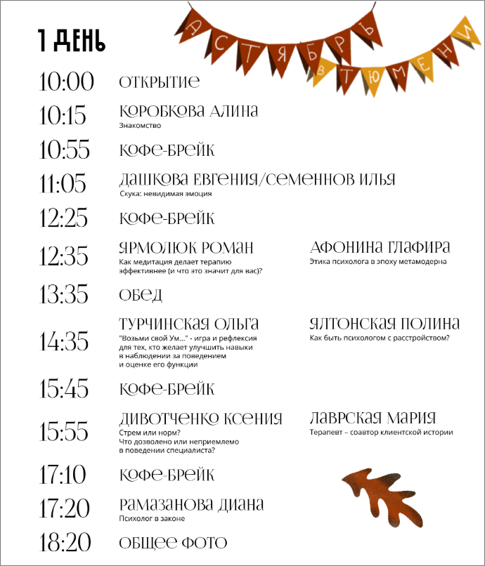 Будут 1-2 линейки выступлений, среди которых: мастер-классы, воркшопы, тренинги навыка, кейс-стади, практикумы, паблик-токи, игры, знакомство друг с другом и с АКПН. А еще много живого общения и уютные прогулки по осенней Тюмени.