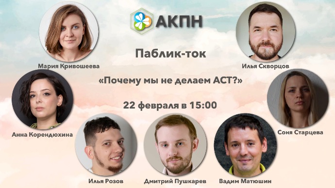 22 февраля мы соберемся и поговорим о том, как делать АСТ, а не говорить о нем. Хотя, все вокруг говорят делать АСТ. А не говорить о нем.
